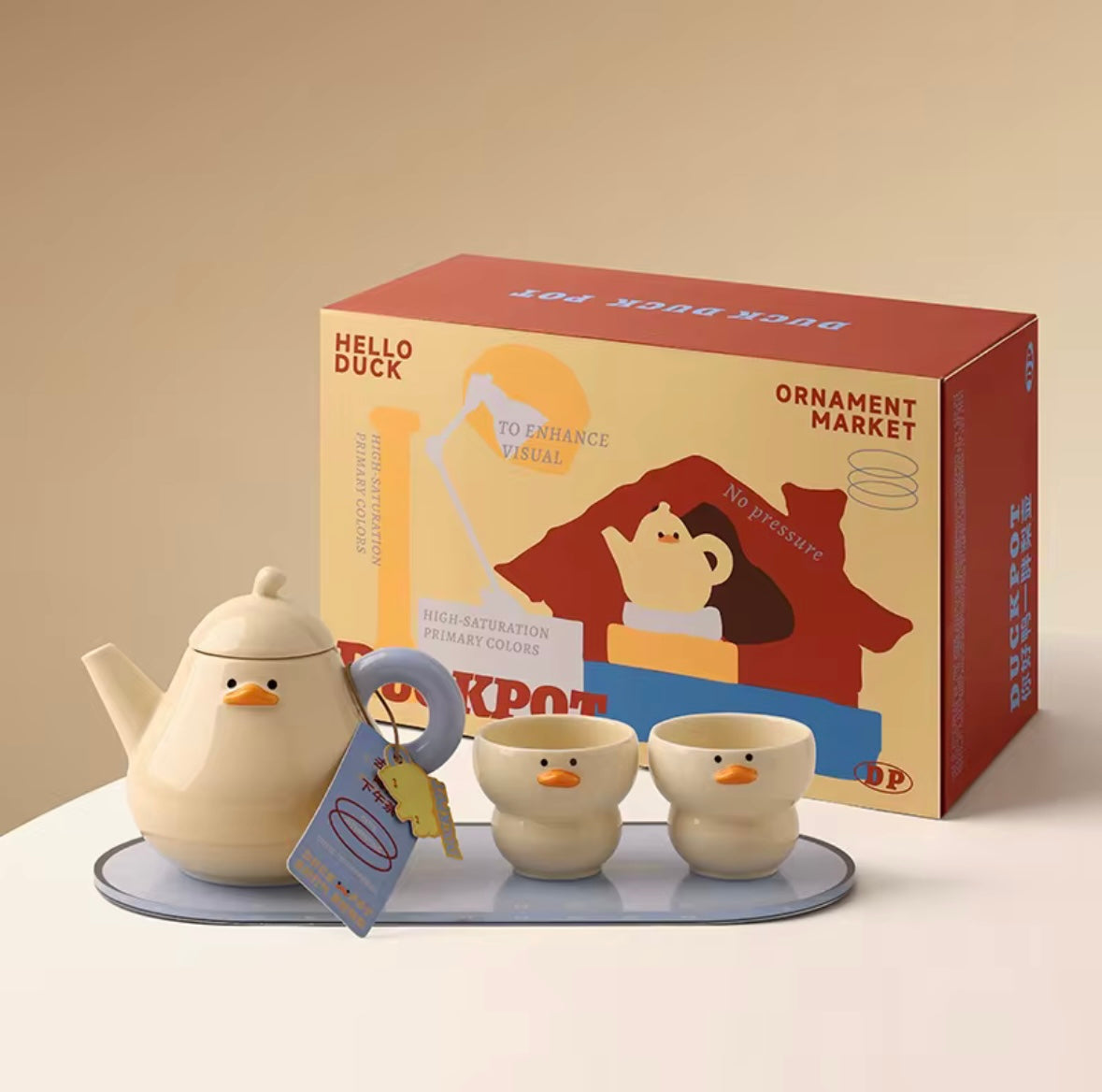 طقم شاي سيراميك “Hello Duck” الساحر – مثالي لمحبي الشاي واللحظات الدافئة. يتكون الطقم من ٤ قطع: إبريق مع غطاء، كوبين متطابقين، وصينية تقديم. تصميم وجه البطة اللطيف يجعله هدية مميزة للأصدقاء أو العائلة