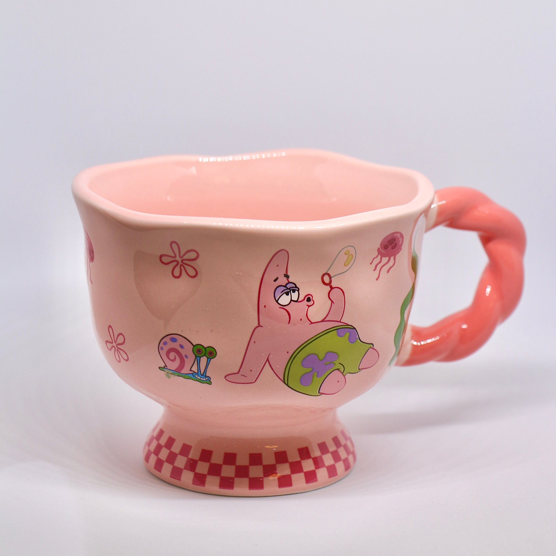 كوب سيراميك باتريك اللطيف – مثالي لعشاق سبونج بوب ومحبي الأجواء الهادئة! يتميز بلون وردي ناعم مع رسومات باتريك وغاري، وتصميم قناديل البحر الممتعة. المقبض الوردي الملتوي والقاعدة المزخرفة بالمربعات يضيفان لمسة مرحة. مثالي للقهوة، الشاي، أو الشوكولاتة الساخنة